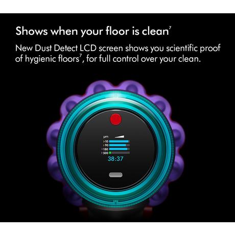 The Dust Detect LCD screen provides you with scientific evidence of your floors' impeccable cleanliness. It showcases the results of our powerful suction technology, ensuring no trace of dirt remains. Additionally, it displays the remaining run time, keeping you informed and in control. Discover a new level of cleanliness with Dyson's GEN5DETECT cordless stick vacuum cleaner. Say goodbye to dirt and hello to spotless floors.