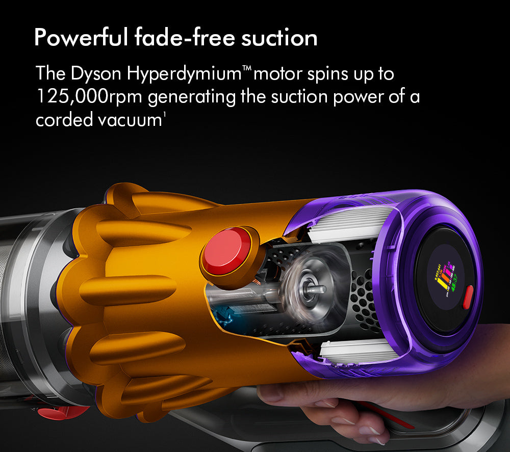 - Powered by the Dyson Hyperdymium™ motor spinning at up to 125,000rpm, it matches the suction power of a corded vacuum.