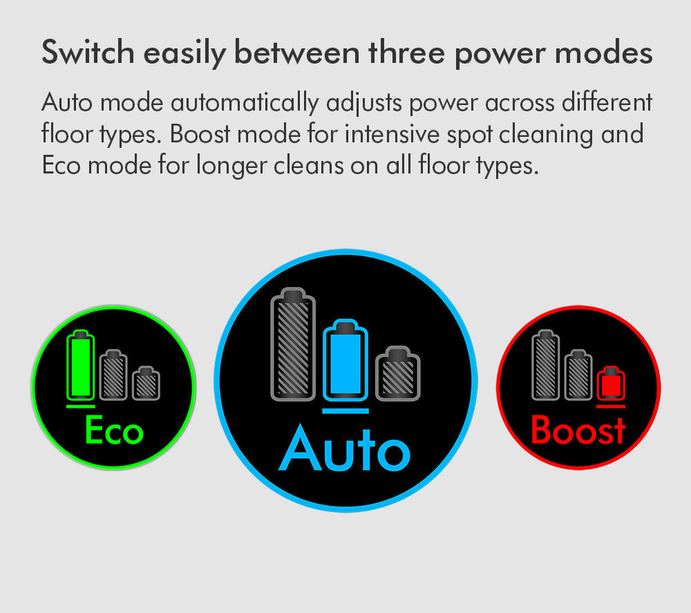 Boost Mode: Provides maximum suction for intensive cleaning.