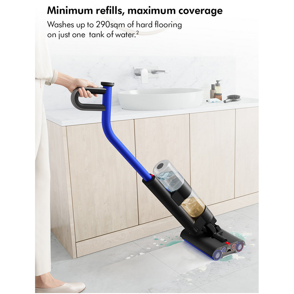 The Dyson WashG1™ can clean up to 290sqm of hard flooring on a single tank of water—equivalent to the size of a tennis court—minimizing refills and maximizing coverage. Plus, with up to 35 minutes of run time powered by a click-in battery with four lithium-ion cells, you'll have all the power you need to tackle your floors.