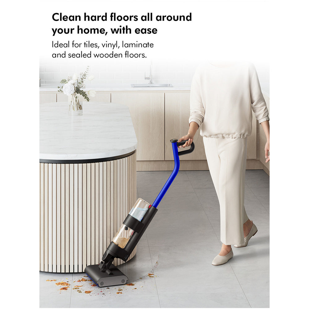 The Dyson WashG1™ wet floor cleaner is designed to give your hard floors the deep clean they deserve. This innovative cleaner removes wet and dry dirt in a single pass, using clean water throughout the entire cleaning process. Whether it's spills, debris, pet hair, or stubborn dried-on stains, the Dyson WashG1™ tackles them all with ease, making it ideal for all types of hard floors.